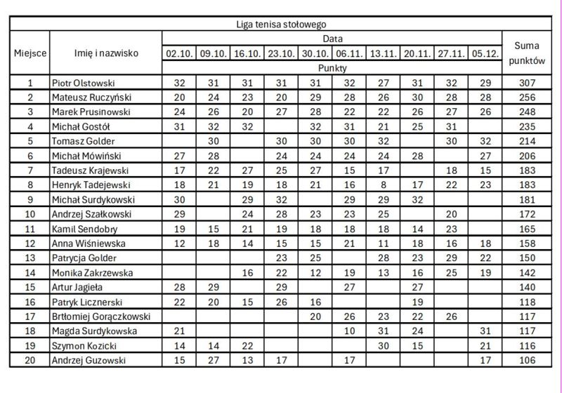 Tym razem w piątek 5 grudnia rozegrana została 10 kolejka naszej ligi. Na turniej przybyło 24 zawodników, w tym zawodnicy z Grunwaldu i Ostródy, którzy zajęli wysokie miejsca. Również na uwagę zasługuje bardzo dobra gra Magdy Surdykowskiej, która w półfinale pokonała Piotra Olstowskiego, ale w finale musiała uznać wyższość Tomasza Golder, który wygrał turniej.