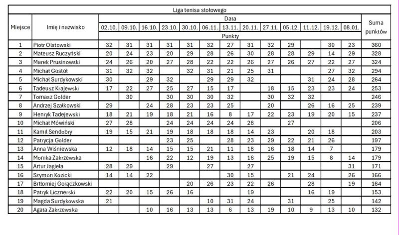 W czwartek 8 stycznia odbyła się 13 kolejka naszej ligi. Bezkonkurencyjny tego dnia był Michał Gostół, który w półfinale pokonał Michała Surdykowskiego 3-1, a w finale Artura Jagiełe 3-0. Gratulujemy. Dobrze tego dnia zaprezentowali się Mateusz Ruczyński z Grodziczna oraz Szymon Witkowski z Grunwaldu zajmując odpowiednio 4 i 3 miejsce.
