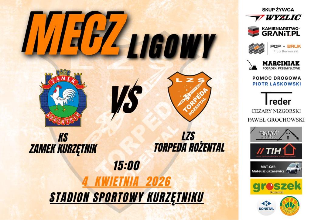 15:00 KS Zamek Kurzętnik – LZS Torpeda Rożental – ul. Betoniarska 8a, Kurzętnik