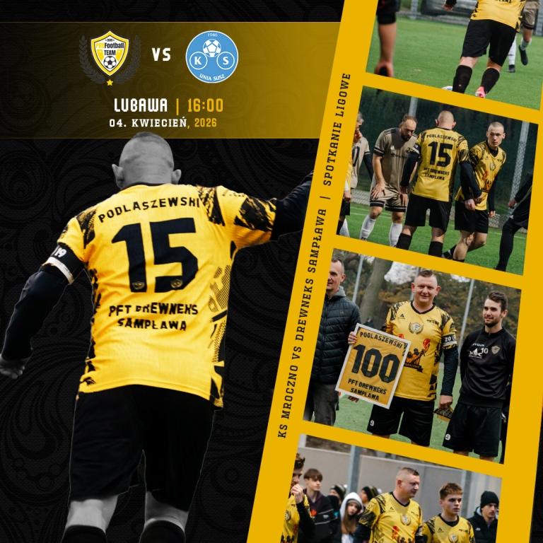 16:00 PFT Drewneks Sampława – KS Unia Susz – ul. Józefa Wybickiego 12, boisko ze sztuczną nawierzchnią w Suszu