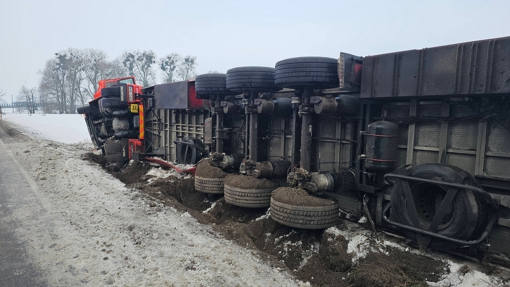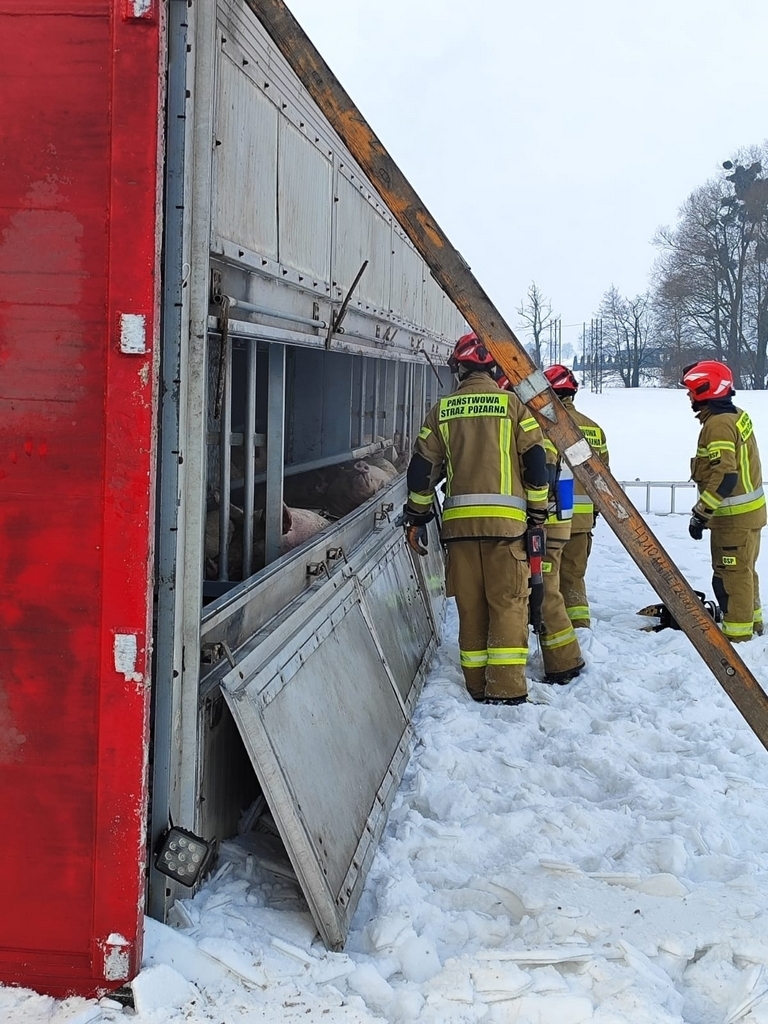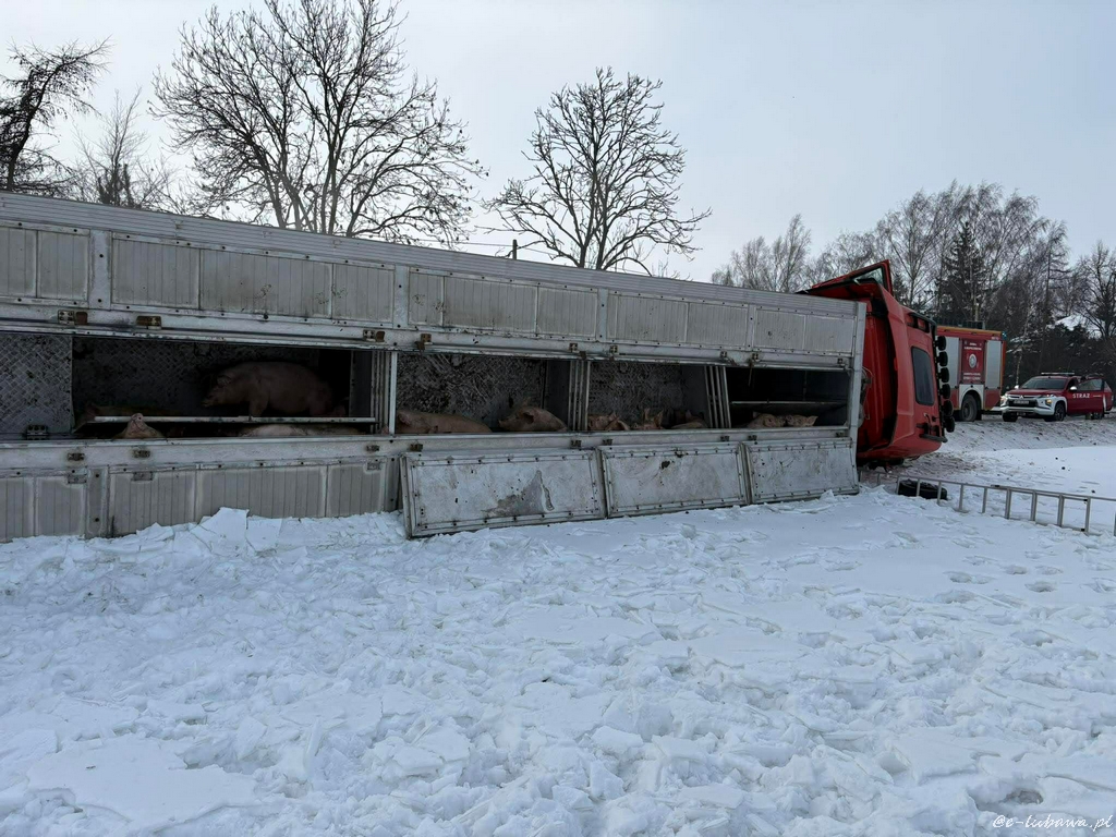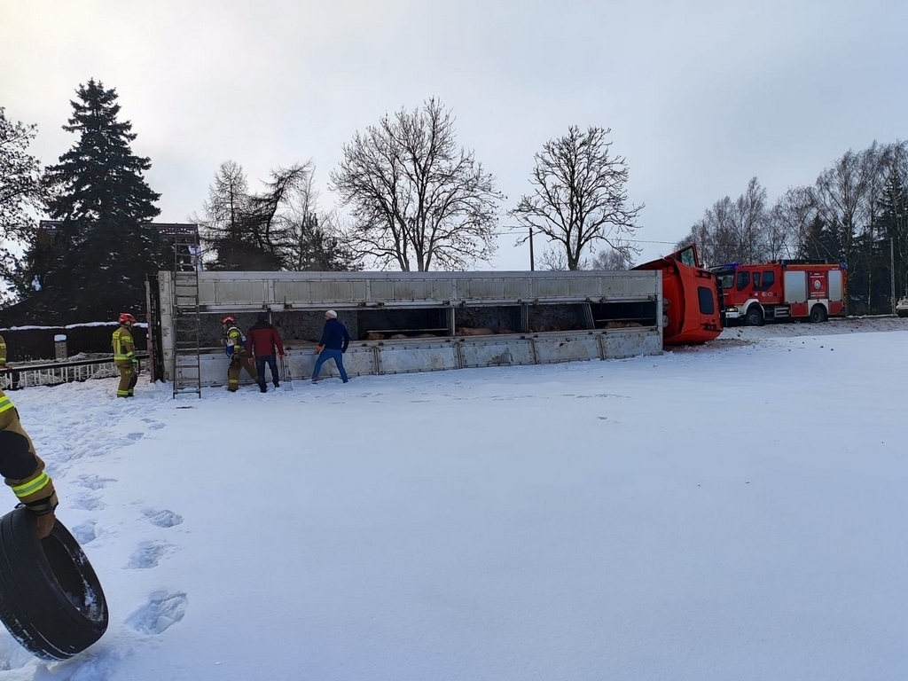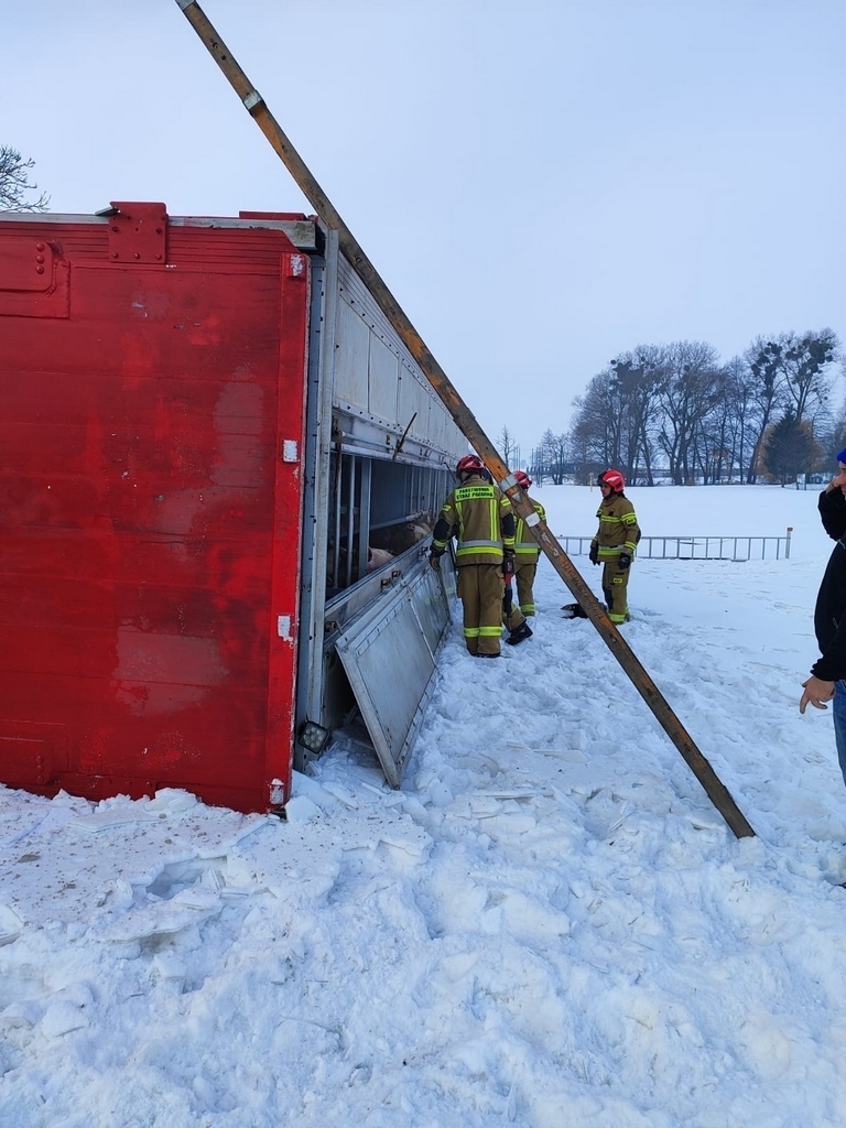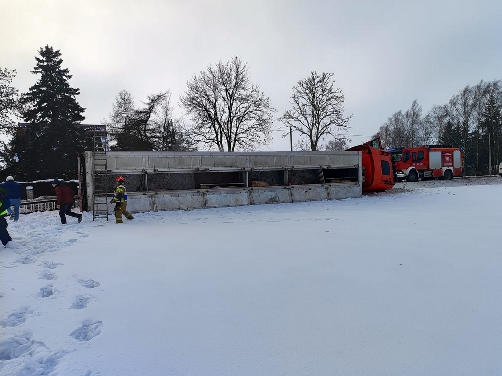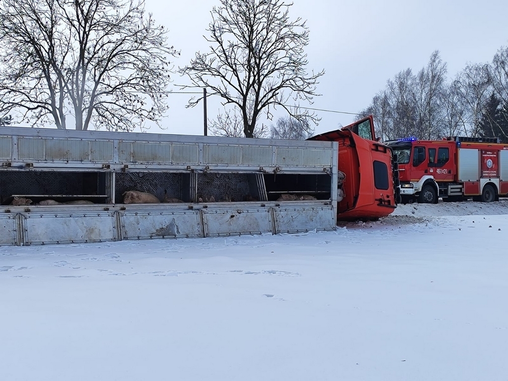 Samochód ciężarowy wiozący dorosłe świnie w okolicy Lubawy wpadł do rowu