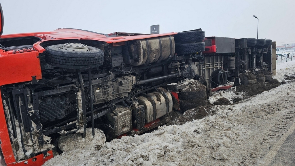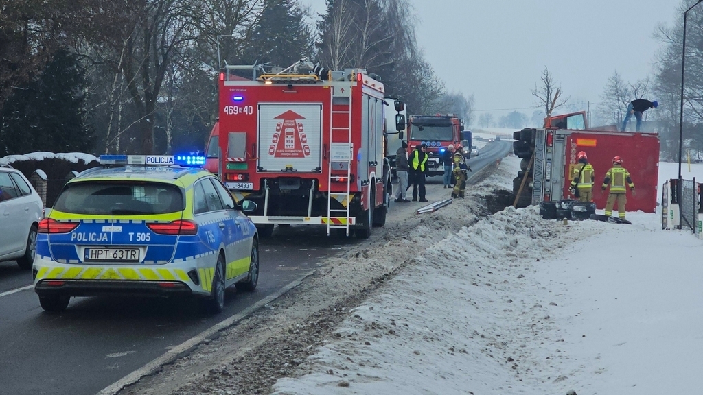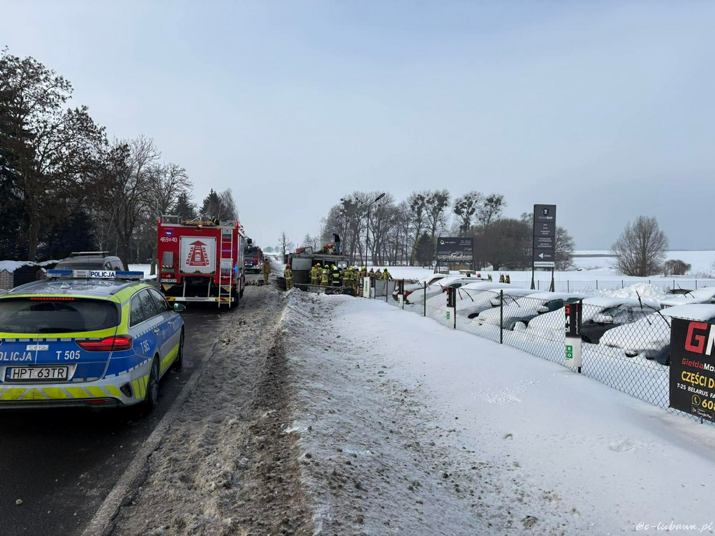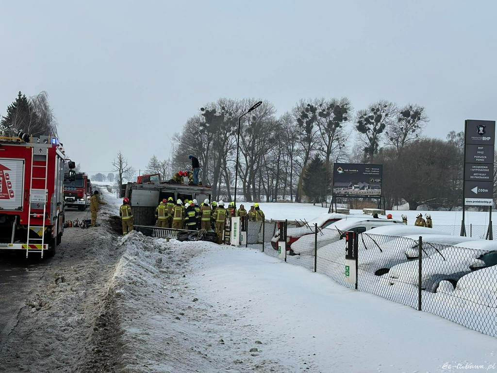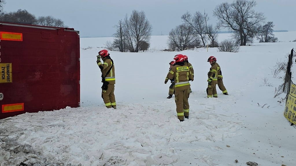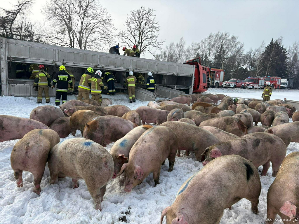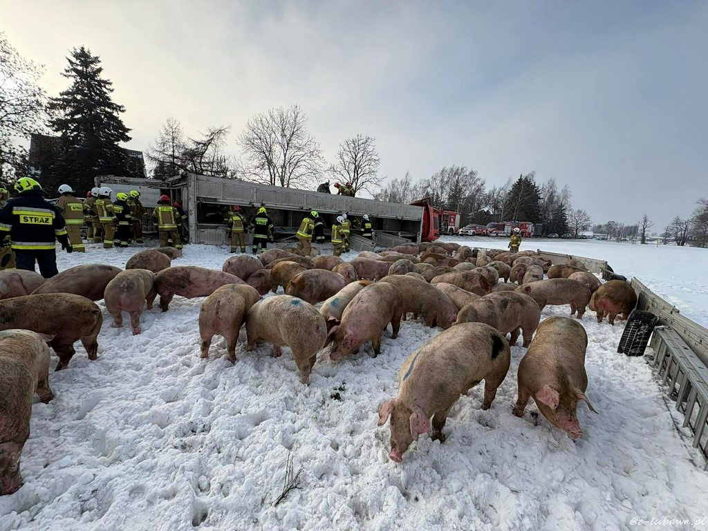 Samochód ciężarowy wiozący dorosłe świnie w okolicy Lubawy wpadł do rowu