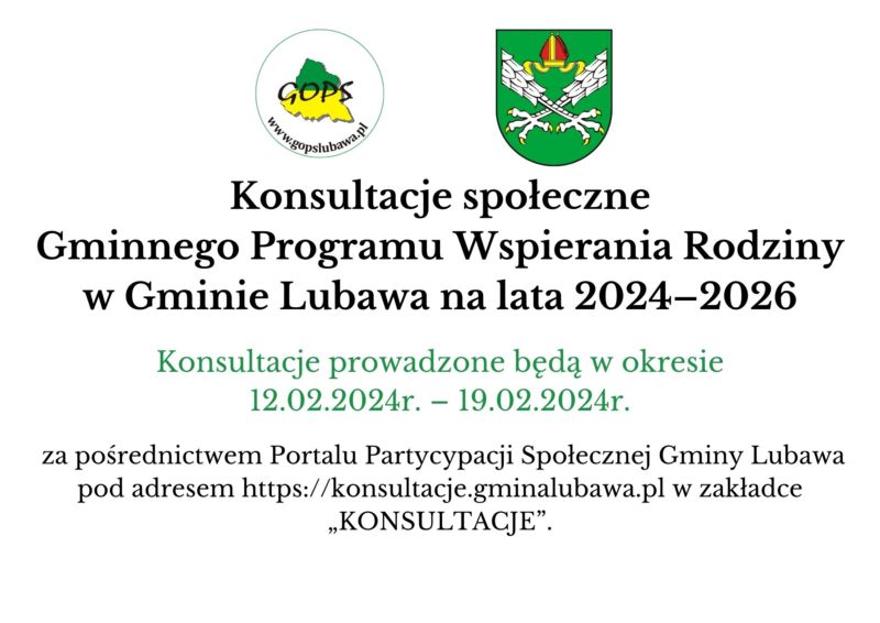 Zapraszamy mieszkańców gminy Lubawa do aktywnego włączenia się w proces konsultacji projektu Gminnego Programu Wspierania Rodziny w Gminie Lubawa na lata 2024-2026. Państwa uwagi i wnioski będą stanowiły istotny wkład w prace związane z opracowaniem ostatecznego kształtu dokumentu. Uwagi lub wnioski zgłoszone po 19.02.2024r. pozostawia się bez rozpatrzenia.