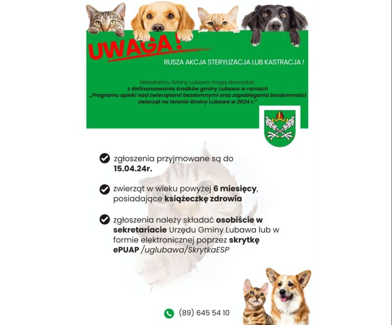 Zainteresowanych właścicieli zwierząt w wieku powyżej 6 miesięcy prosimy o zapisywanie się z podaniem wszystkich niezbędnych informacji. Zgłoszenia należy składać osobiście w sekretariacie Urzędu Gminy Lubawa lub w formie elektronicznej poprzez skrytkę ePUAP /uglubawa/SkrytkaESP w terminie do 15.04.2024r. Telefon kontaktowy 89/6455410. Planowany termin wykonania zabiegów to miesiące maj/czerwiec 2024 r.